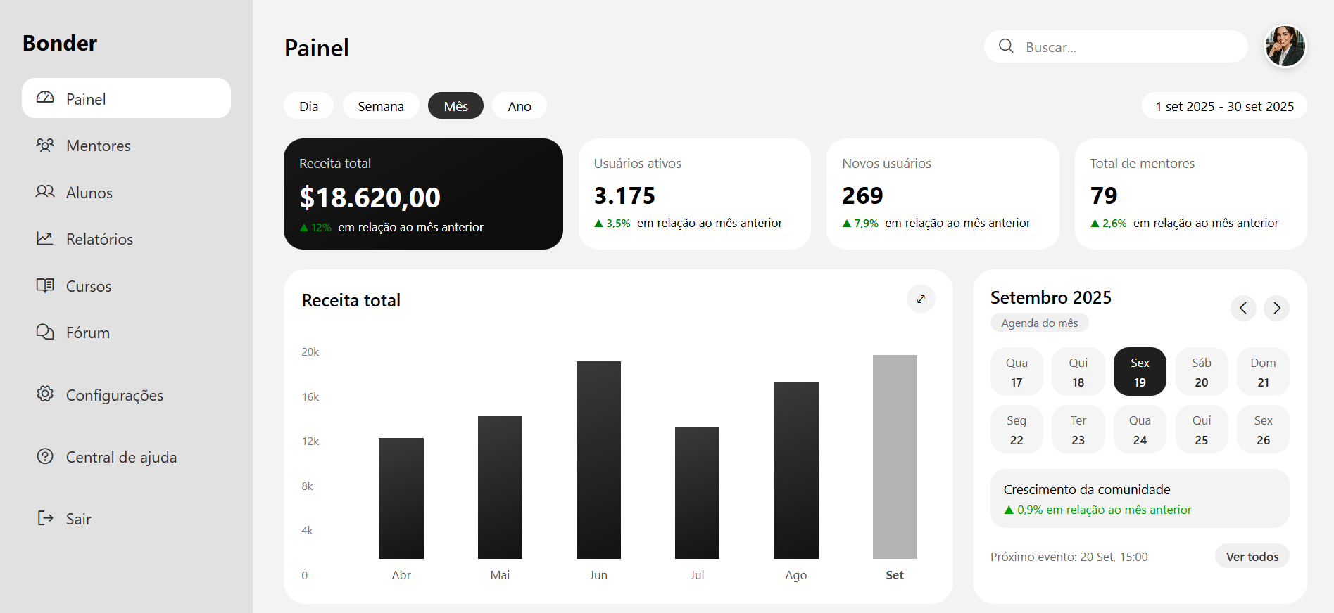 Visão em tempo real de métricas, usuários e operações - tudo organizado pra tomada de decisão rápida.